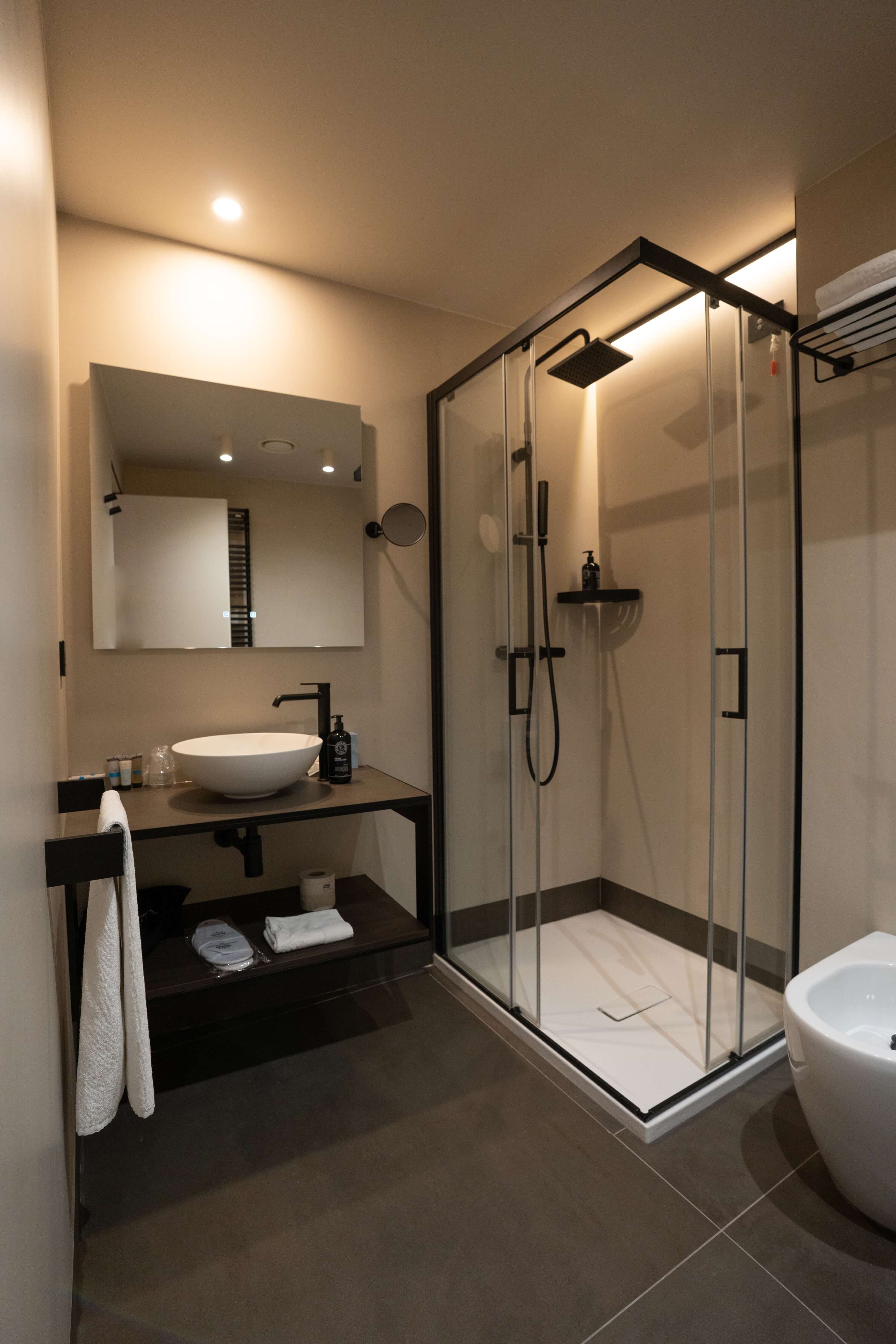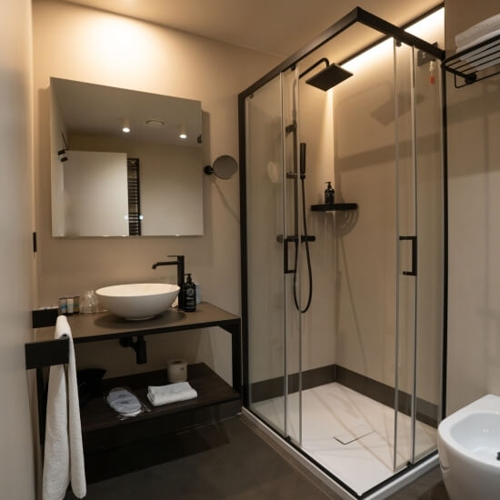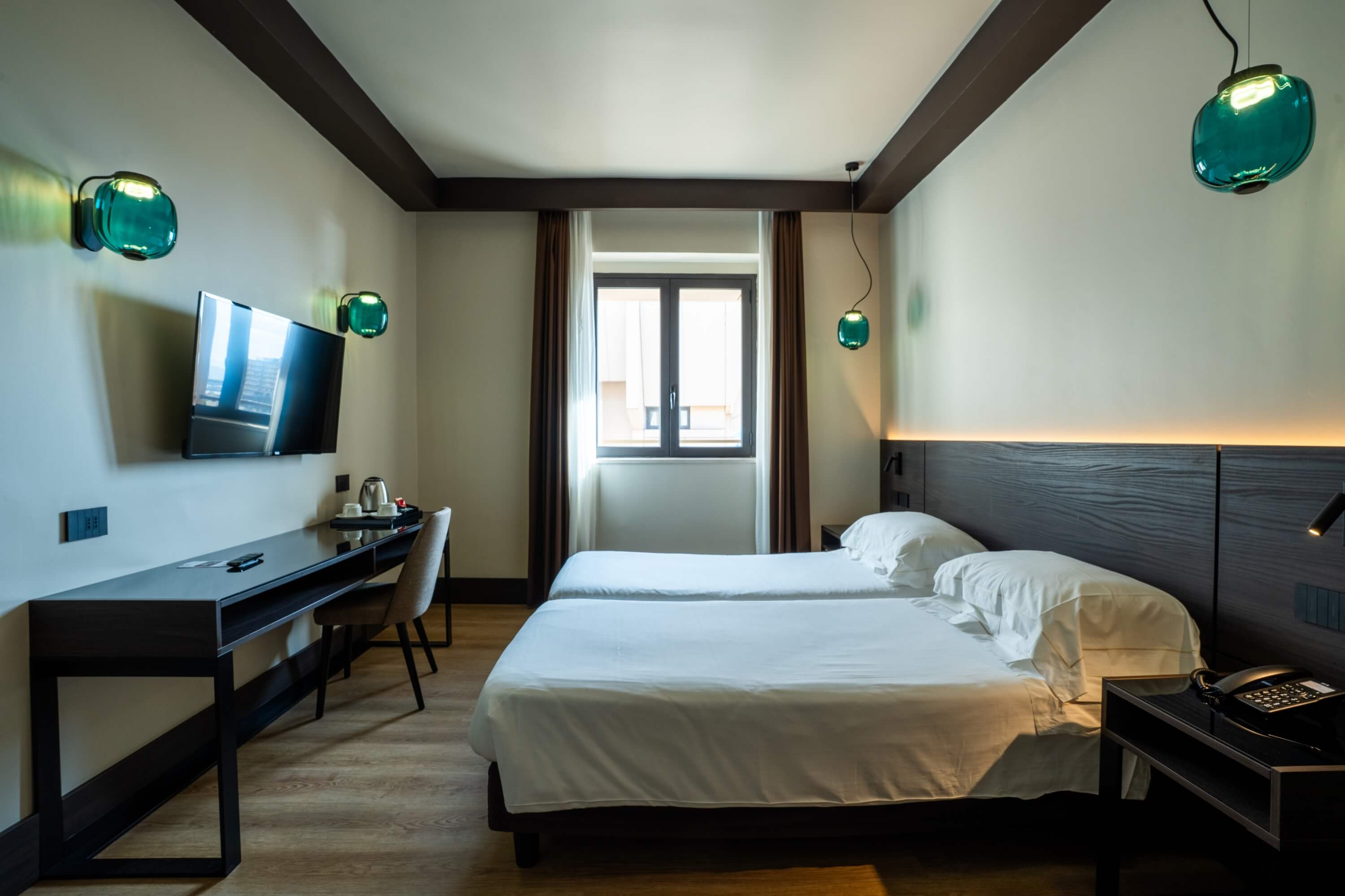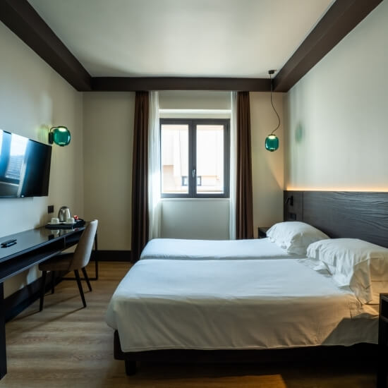 The rooms (14 sqm) are totally soundproofed, offer two comfortable single beds, bathroom with shower, wired internet connection and wi-fi, computerised temperature management. They are also equipped with a safe and minibar.